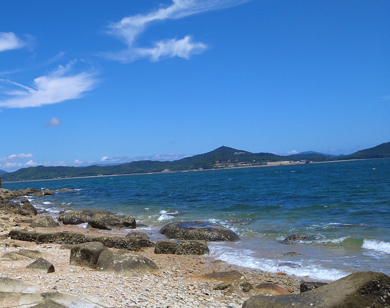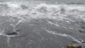 砂利浜サーフ、突き出た部分の先にわずかに生じる離岸流。ちなみに砂利浜ではワンド部分と岬部分が連なり、カスプを形成することも多々あります。